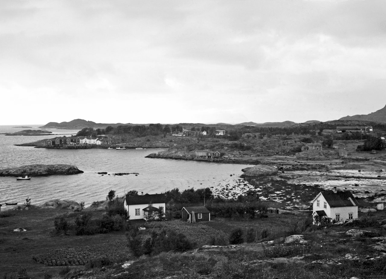 Sommeren 1950. Bygningene på det gamle handelsstedet i Husbynesset står ennå. Vi ser også det gamle fjøset til Husbygodset.